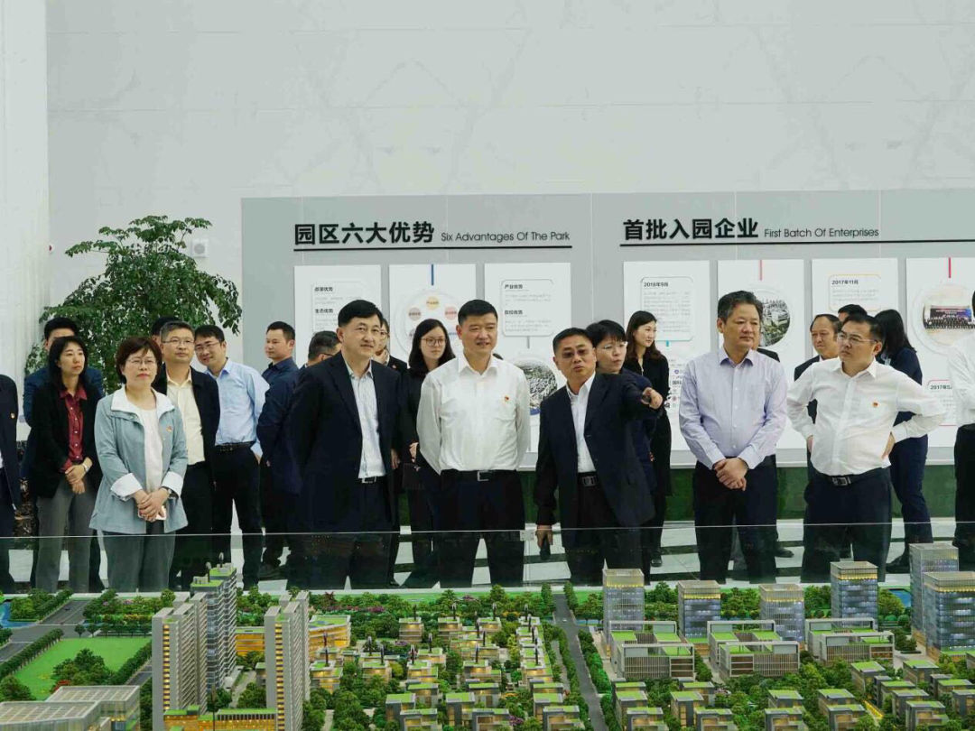 在产业园招商中心,国测集团董事局副主席、集团总裁朱江向来访领导系统介绍了产业园发展规划、招商运营等情况。随后,来访领导一行实地考察了建设现场。